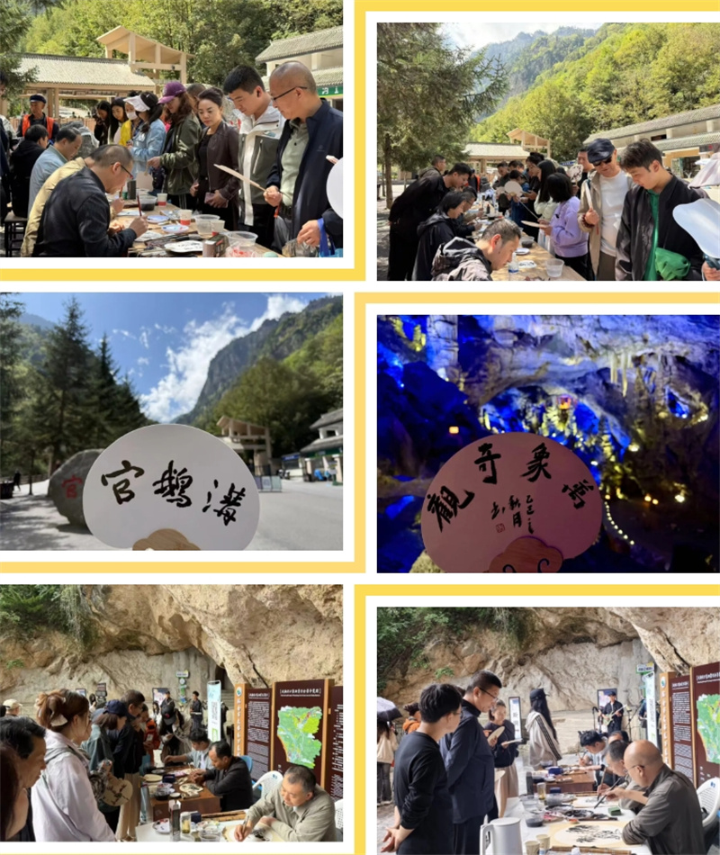 在官鹅沟与万象洞景区的入口处,书画创作成了游客驻足打卡的热门站点。书画家们运笔挥毫,以陇南的秋景为灵感,在团扇上将官鹅沟的层峦叠嶂、流水飞瀑,万象洞的奇绝钟乳、幽深洞景,化作一幅幅灵动的美术作品;题写下“惠风和畅,心旷神怡”的美好、“陇南秋韵,名不虚传”的赞叹。一笔一划间,尽显书画艺术的魅力,也让陇南风光以更雅致的方式走进游客心中。现场游客们纷纷围拢观看,不时发出阵阵赞叹,不少人还主动提出“定制”需求——“能否画一只落在红叶上的小鸟?”“想写一句送给孩子的祝福”,书画家们一一满足,将饱含心意的作品赠予游客,拿到专属书画作品的游客们喜出望外,直言“这是此次陇南之行最特别的礼物”。