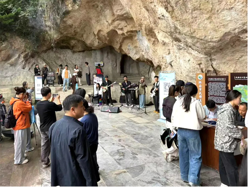 如果说书画是陇南秋景的“静态注脚”,那北纬33度乐队的现场演出便是秋日里的“动感乐章”。《曾经的你》《后来》《漂洋过海来看你》等一首首经典歌曲响起,熟悉的旋律瞬间点燃现场氛围,游客们纷纷驻足,或跟着节奏轻轻哼唱,或举起手机拍下精彩瞬间,更有游客情不自禁跟随着节奏翩翩起舞,现场欢声笑语不断。一位来自四川的游客说:“没想到在景区还能听到这么棒的现场演出,感觉整个人都放松了,这趟旅行太值了!”