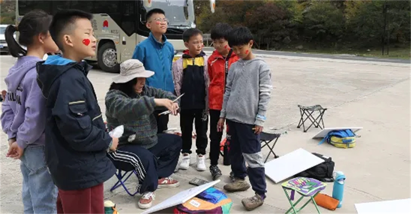 我们带孩子选择在十一的时候来到九龙湾写生,是因为九龙湾的山在呼市周边我觉得是非常壮阔的,因为它具有断崖面特别耸立的一种峭壁的感觉,又有像白桦林铺展的金黄色的味道,特别适合在秋天写生。