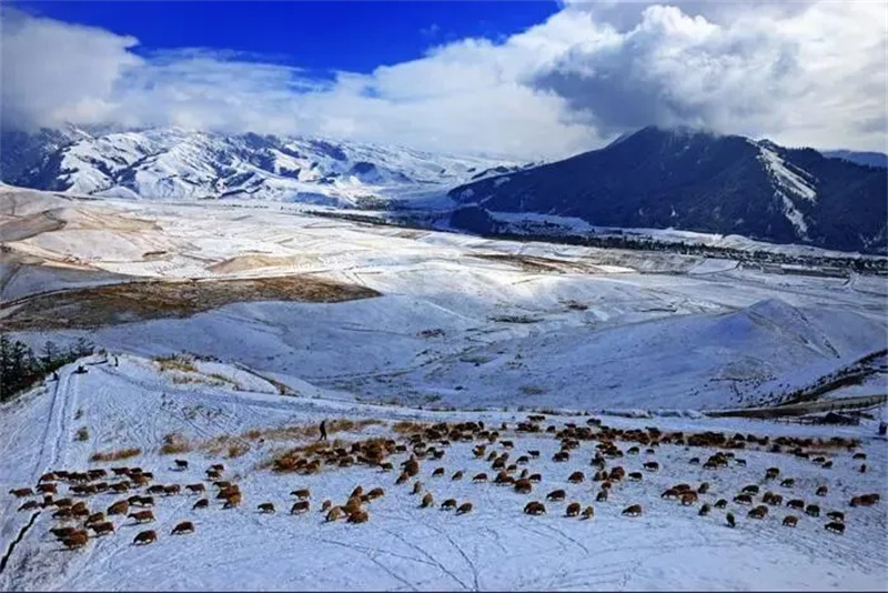 祁连大草原的冬阳是软的,晒在雪地上,暖得让人想躺下来。雪层下的枯草隐约可见,牛羊在雪坡上慢悠悠啃食,尾巴扫开的雪沫子像碎玉。躺在雪堆旁,看云在天上走得更慢,偶尔有雪雀掠过,翅膀带起的雪粒落在脸上,凉丝丝的却不刺骨。忽然来一阵微风,雪沫子打着旋儿飞,远处帐篷的炊烟袅袅升起,和雪雾融成一片,牧民的歌声从风中飘来,比夏风更醇厚。