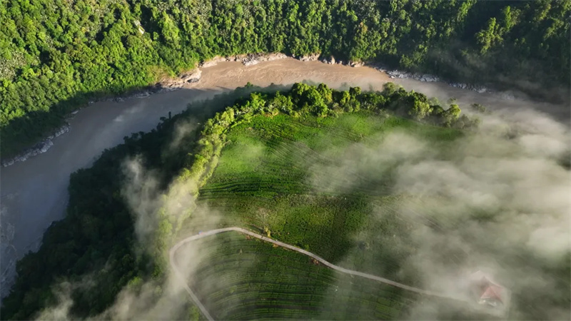 站在观景台上,雅鲁藏布江以一种近乎温柔的姿态,环抱着一整片茶田。云雾低垂时,茶垄若隐若现,江水与茶山在朦胧中融成一幅流动的水墨画。这是果果塘独有的风景,也是墨脱春天里,最治愈的一帧。