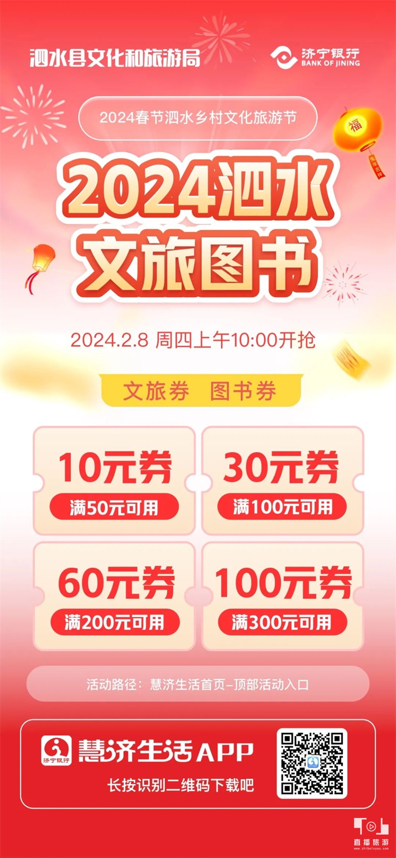 为进一步激发春节假期文旅市场活力,全面提振文旅消费,泗水县文旅局通过慧济生活APP发放文旅综合消费券、图书定向券共10万元,满50减10元、满100减30元、满200减60元、满300减100元, 适用于县内部分餐饮住宿(旅游类)、文创产品、影视图书、文化娱乐的独立法人企业或个体商户。