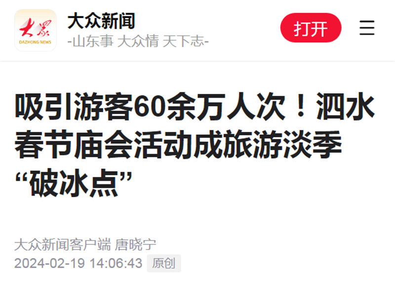 春节假期期间,泗水县文旅局以传统文化活动为吸引,以景区景点为依托,大力开展庙会节事活动,不断丰富群众文化生活,推动文旅深度融合,全面提振春节期间文旅市场消费。综合各方数据进行测算,假期8天,全县各主要景点累计接待游客60余万人次,实现旅游收入1200余万元,同比增长343.25%,取得龙年文旅市场开门红!