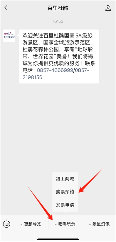 1.预约购票流程页面图:关注“百里杜鹃”微信公众号→菜单栏处点击吃喝玩乐按钮→进入分时购票预约页面(选择票型、预约日期、预约时段)→确认信息无误后,填写游览人姓名、身份证号、联系电话→下单并支付→订单完成。