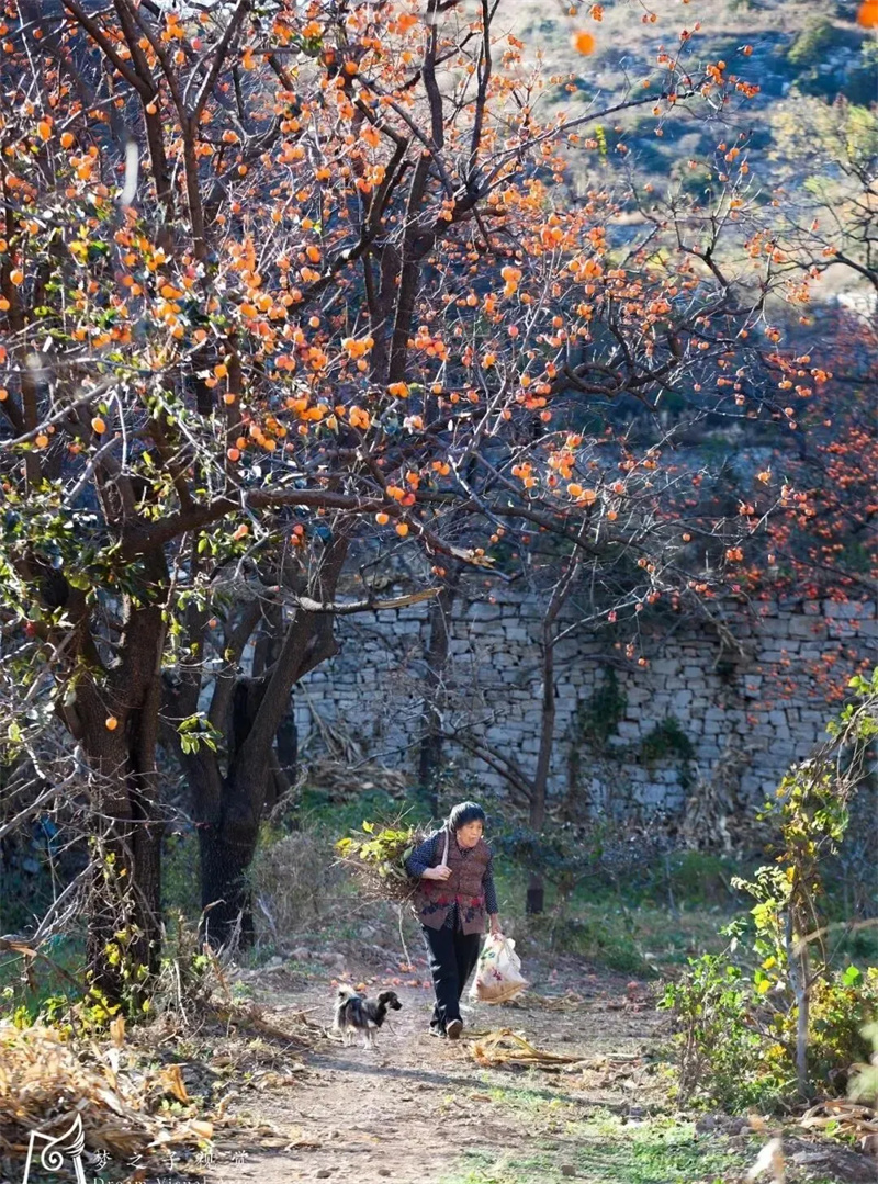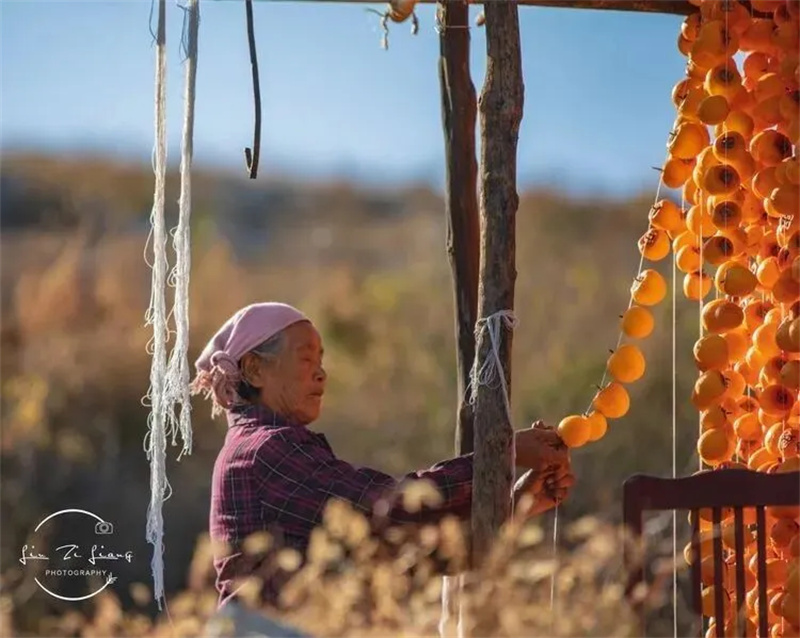 置身秋日乡村,处处感受到一股丰收的气息,一个个红彤彤的柿子垂在苍劲的枝干,摘下后用绳子绑成串、连成条,在阳光的照射下,愈发饱满盈实、娇艳欲滴。