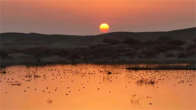 位于达来呼布镇东20公里,是我国第三大沙漠巴丹吉林沙漠的北缘部分。秋季水源补给后,这里呈现出独特的“沙水相依”景观,成为候鸟迁徙中的特殊补给站,数千只赤麻鸭、绿头鸭在此短暂停歇,补充体力后继续南迁。