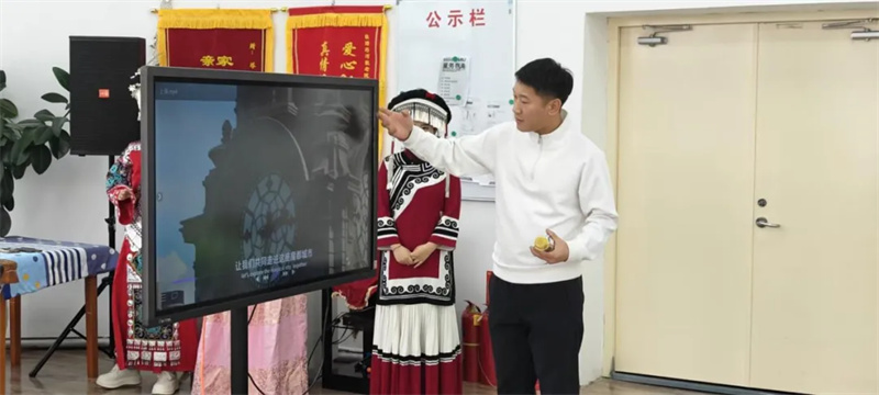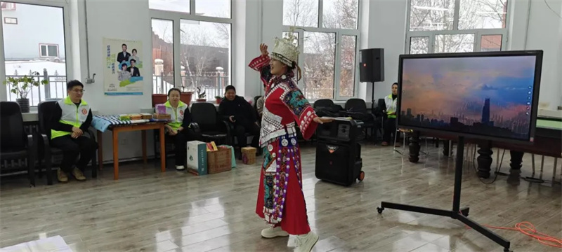 除了视觉的盛宴,活动更设置了“味觉中国”互动游戏环节,联动全国12个省份,将各地极具代表性的特色糕点美食直抵现场。老人们品尝着风味各异的点心,仿佛完成了一次舌尖上的跨省旅行。而在“非遗时光”展示环节,县文旅宣传队的队员们化身文化使者,通过动态的演绎,将藏族献哈达的庄重礼仪、苗族银器服饰的璀璨华美、蒙古族舞蹈的奔放豪迈等民族文化精髓一一呈现。科技的温度与演绎的热情,共同消融了地理的隔阂,在方寸之间铸牢了中华民族共同体意识。