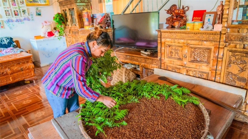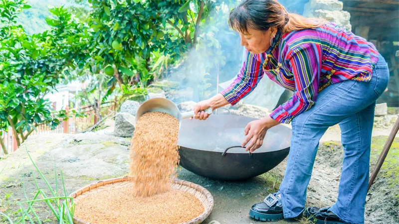 鸡爪谷是制作黄酒的关键原料。制作时,先将鸡爪谷脱粒,与研磨成颗粒的玉米一起炒熟、煮熟,待散热后撒上自制酒曲,发酵1-3天,再密封保存2-3个月,最后通过竹筒或葫芦过滤,便制成了色泽黄褐、清香甘甜的黄酒。