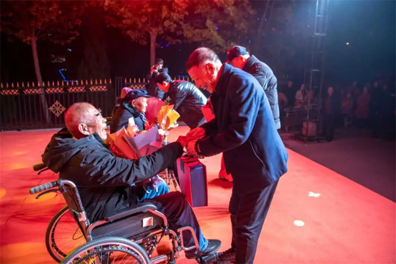 整场晚会最动人的高潮出现在敬老献花与诗歌吟诵环节。当社区内60岁、70岁及80岁以上的老寿星们分批登台,从子女手中接过承载感恩的鲜花时,他们脸上洋溢的幸福笑容,成为了“孝”最生动的注脚。老人与子女代表共同吟诵的原创诗歌《孝行天下 爱满人间》,以铿锵深情的诗句,将孝道传承的真谛与人世间的温暖大爱抒发得淋漓尽致,深深打动了现场每一位观众。