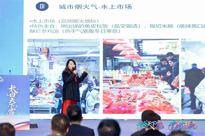 随后的推介环节中让冰雪的多元风采立体呈现。《五彩缤纷的吉林》宣传片与冬季新品发布展现了吉林省丰富的文旅资源和今冬的别样玩法;而延边州冬季文旅宣传片发布,则从自然景观到人文风情,完整勾勒出“长白天下雪·吉美在延边”的文旅画卷。