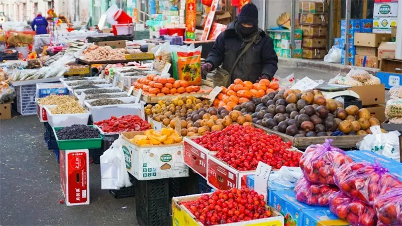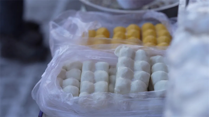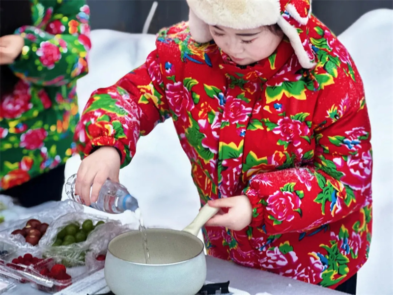 这里是寒风中的人间烟火现场。蒸笼里粘豆包的热气与窗外严寒对话,刚出锅的软糯与冷冻后的Q弹各有千秋。冰糖葫芦的糖衣在冰雪中格外脆亮,是雪地里跳跃的红色音符。最肆意的莫过于“铺满地的大冰糕”——在零下30℃吃雪糕,是只有在这里才能完成的冬日行为艺术。
