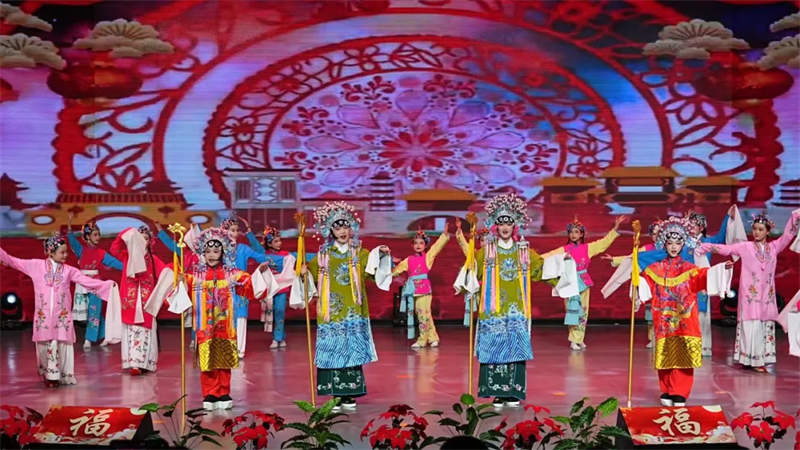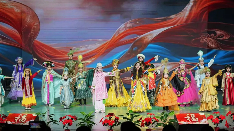 晚会在欢快热闹的开场舞《萌娃闹春 骏马送喜》中拉开帷幕,小演员们身着节日盛装,用充满活力的舞姿瞬间点燃全场氛围。整台晚会分为“灯火初上·良宵启程”“月圆人圆·情满今宵”“星河入梦·共赴新程”三个篇章,节目涵盖歌舞、小品、非遗弹唱、民族服饰秀、戏曲联唱、舞台剧等多种艺术形式,内容丰富、层次鲜明,既有传统文化的厚重底蕴,又有现代舞台的创新表达。