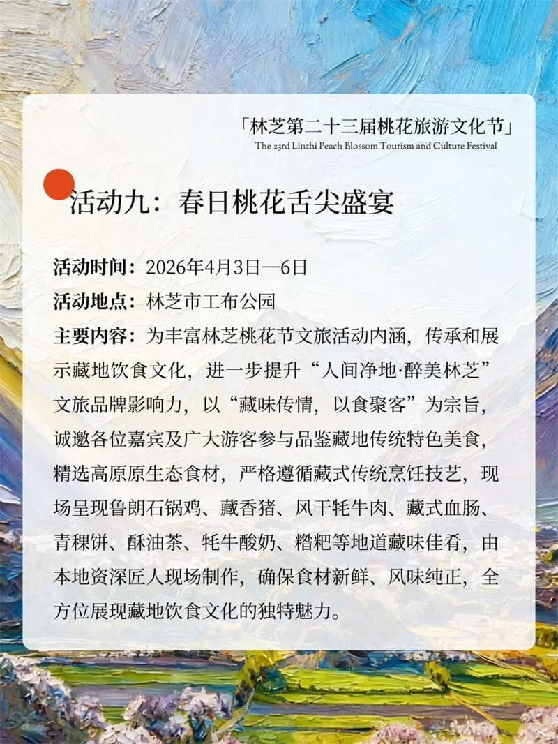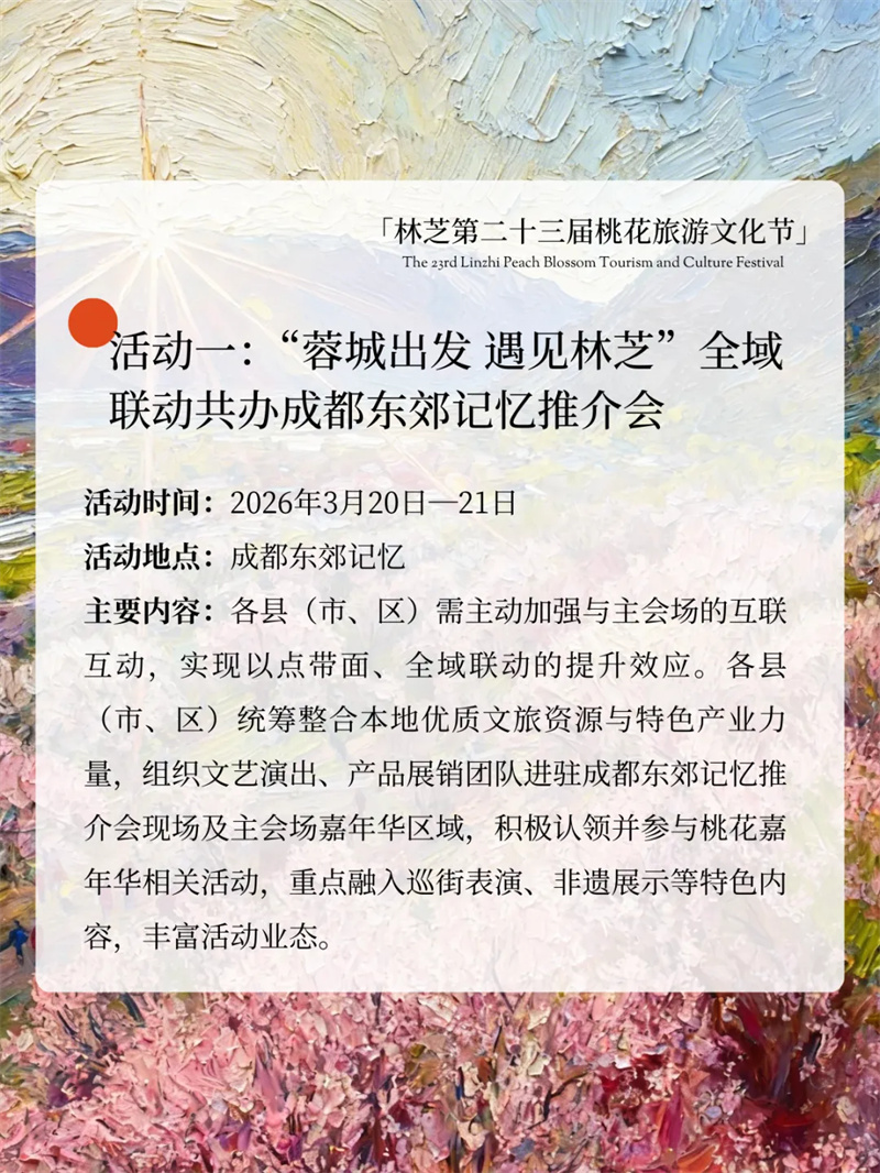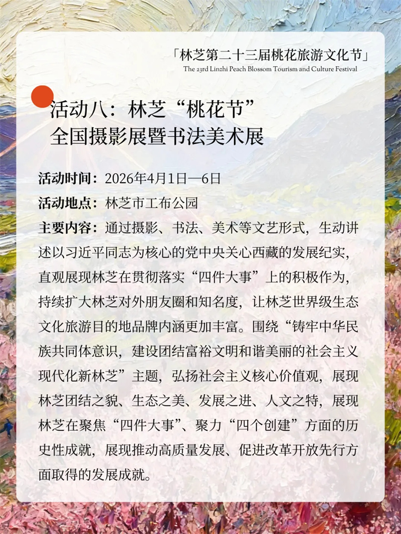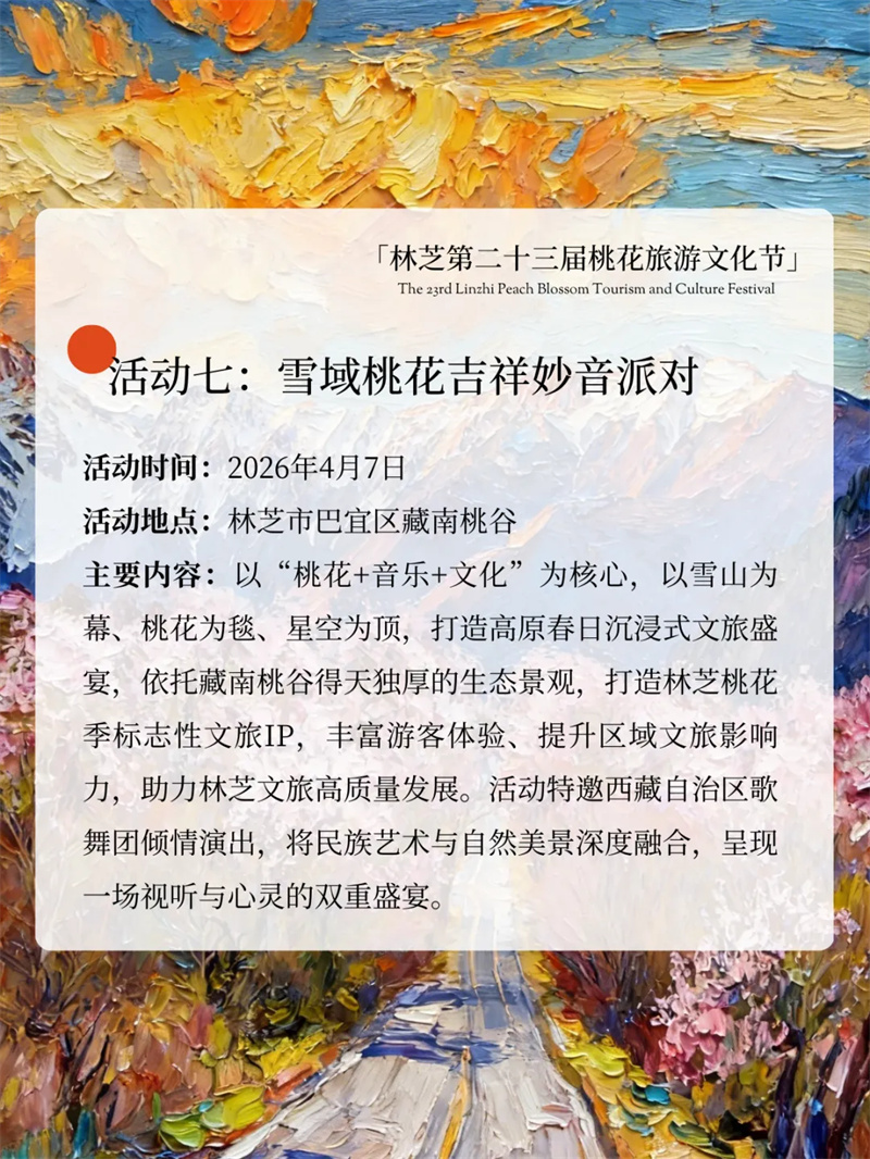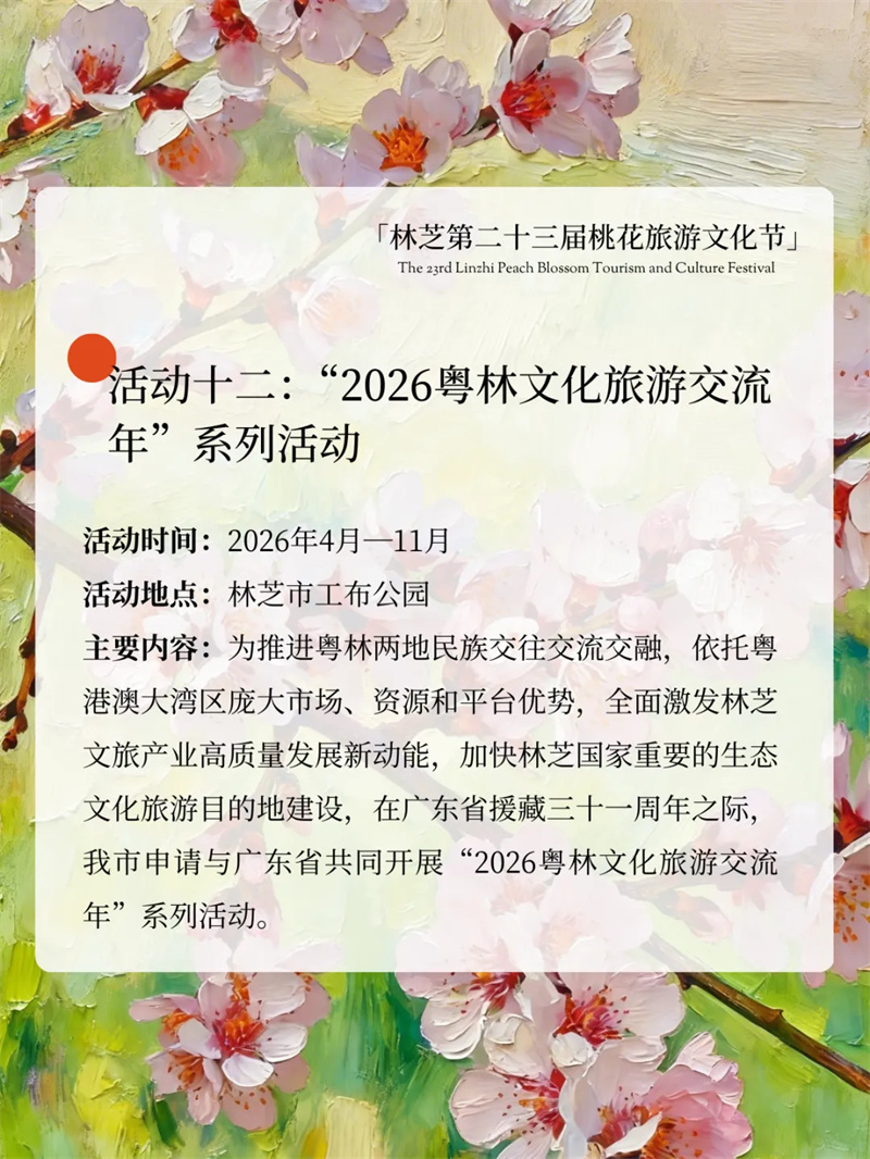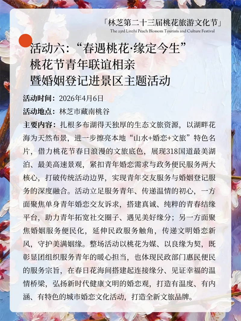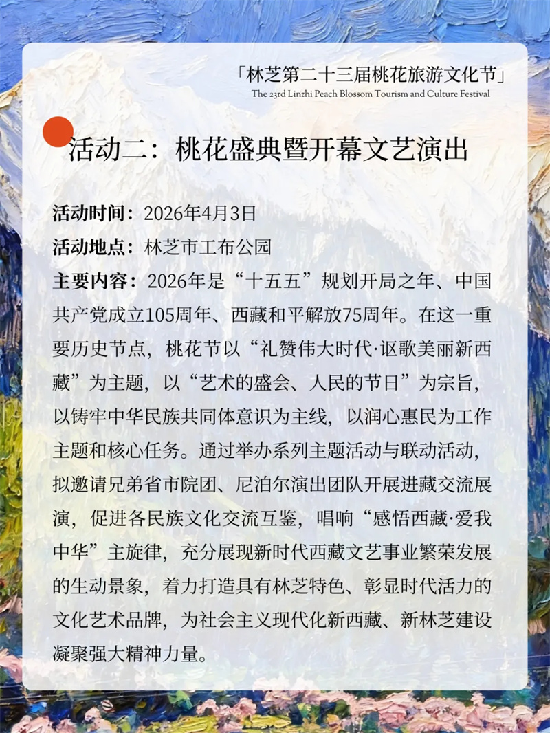 雪域桃花开,林芝等你来!林芝第二十三届桃花旅游文化节重磅来袭!主打沉浸式、年轻化、全龄化,解锁超多新潮玩法,全年龄段都能玩尽兴,享受一场春日文旅盛宴~