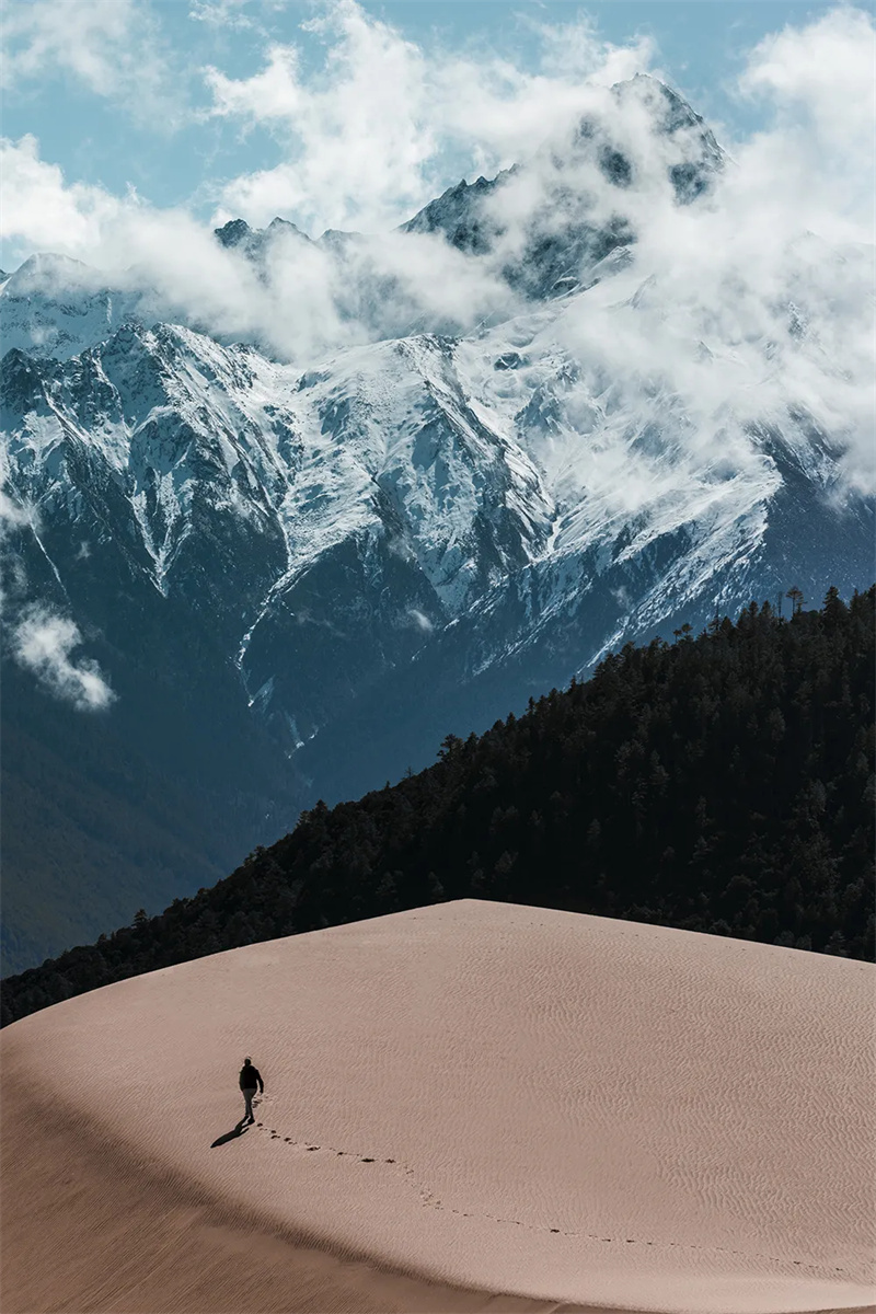 想看雪山与沙丘同框的神奇景象,就一定别错过米林的丹娘佛掌沙丘。
