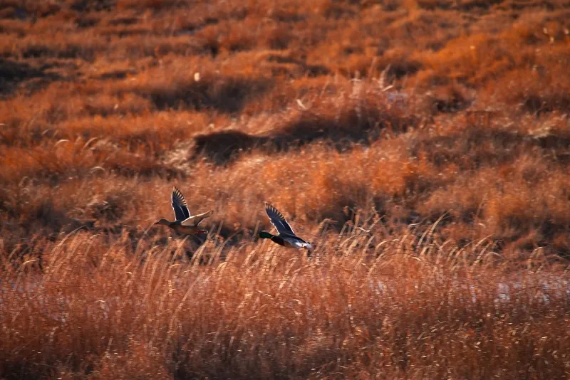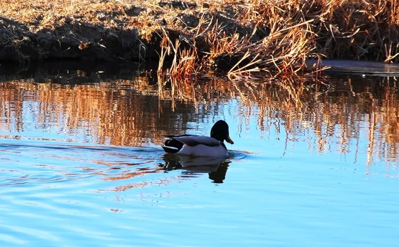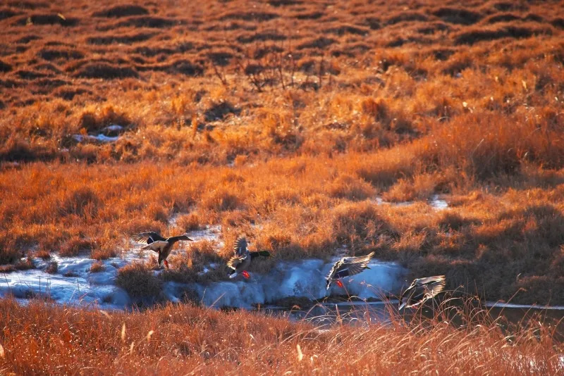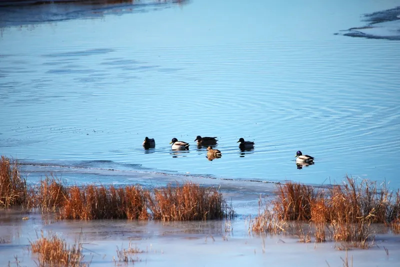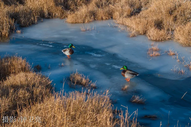 刚走近小溪旁边,便听见“哗啦”一声水响:七八只雄性绿头鸭扑棱着翅膀掠过水面,墨绿的头顶在晨光里泛着金属光泽,黄色喙尖划过波纹,尾羽的绒黑与腹羽的米白在蓝水中织出细碎的光斑。雌性绿头鸭则隐在芦苇根旁,棕褐色的羽毛与枯草融成一片,只偶尔探出尖喙,衔起一截水草,脖颈的弧度轻得像落雪。当地村民告诉记者“它们这几天最爱在浅滩觅食,现在水里的小鱼多,够它们吃一整个冬天。”