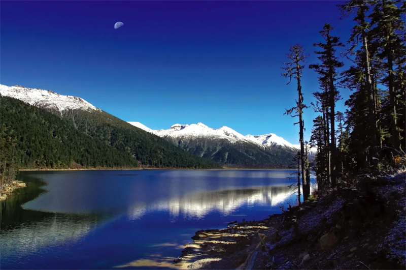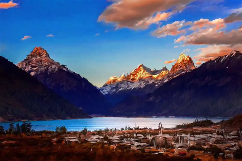 它立于巴松错北岸,始终以阳面面向湖面,天气晴朗、夕阳夕照时,形似一束点燃的火焰,是距离湖面最近、游客们能看到完整山体的雪山。