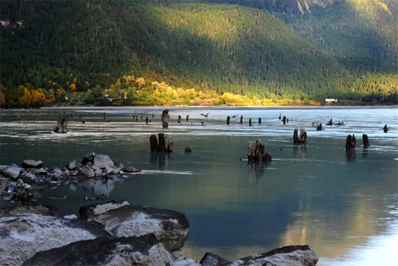 清澈见底的湖水,与远处五彩斑斓的山林、巍峨的雪山交相辉映,像极了一幅浓墨重彩的秋日山水画卷。最妙的是,湖中还有微微露出湖面的老树桩,水波轻轻荡漾,树桩静静伫立,动静相宜,景色美不胜收。