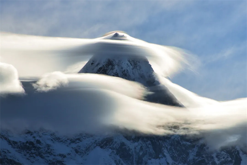 经过冰雪长期堆积,其峰顶被塑造出体量巨大的雪檐,因为它形状看起来也很像扇贝,而亲切地叫它“冰冻的大扇贝”。