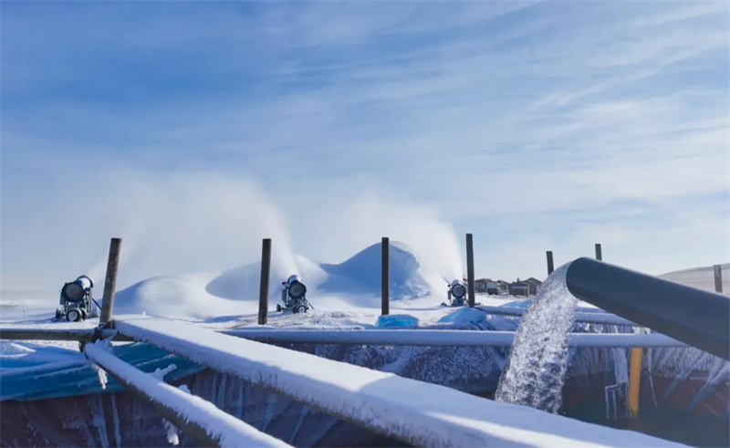 记者在九曲湾景区看到,主会场建设工作正在火热进行,憨态可掬的雪人“乌小白”、象征吉祥的福袋元宝以及身姿矫健的马雕塑等雪景已初步建成。各种打卡场景、雕塑、美食集市均在有条不紊建设中。在布林泉景区,记者看到三台造雪机同时轰鸣喷吐着雪雾,取冰工作已经完成,即将开展冰雕制作,现场一派忙碌景象。