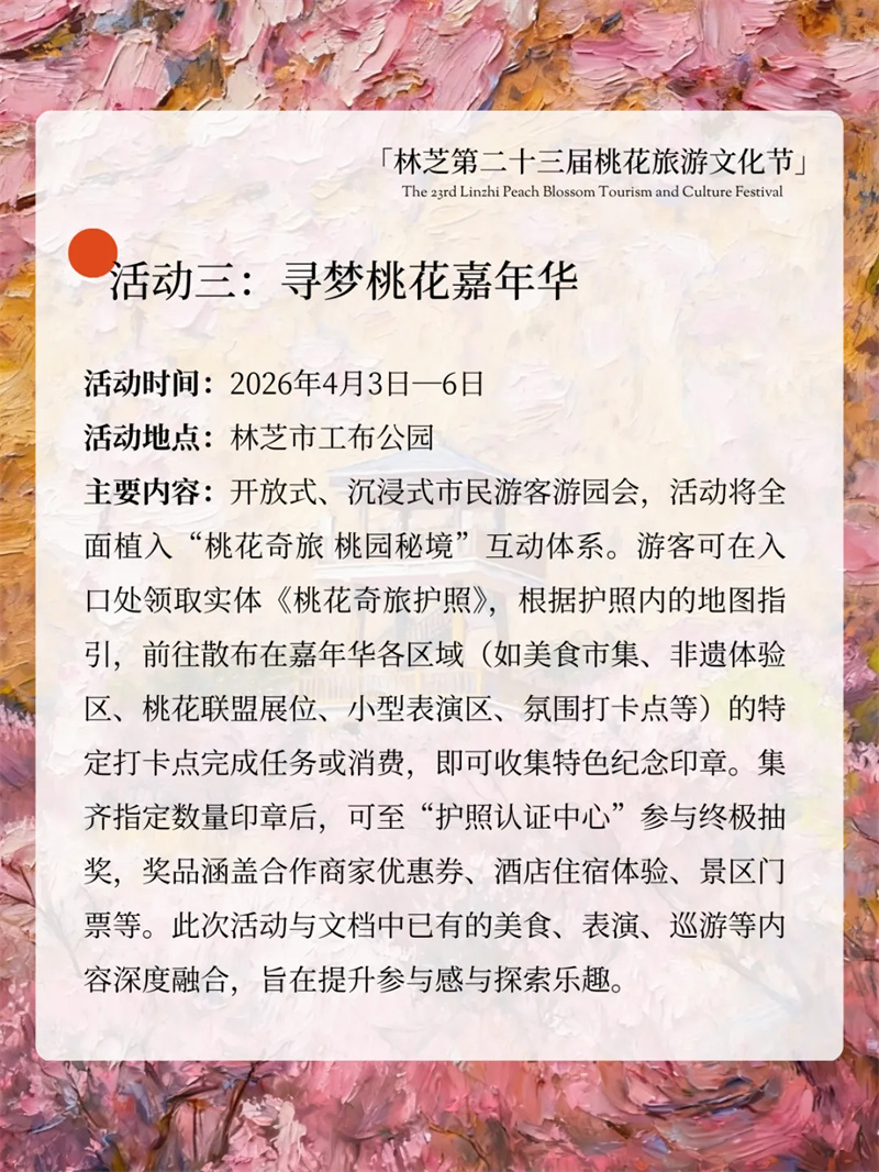 入园领《桃花奇旅护照》,秒变寻宝达人!逛美食市集、非遗区、打卡表演点位,集章就能抽大奖!赏花变探秘,互动感拉满,拍照打卡也超出片~✨