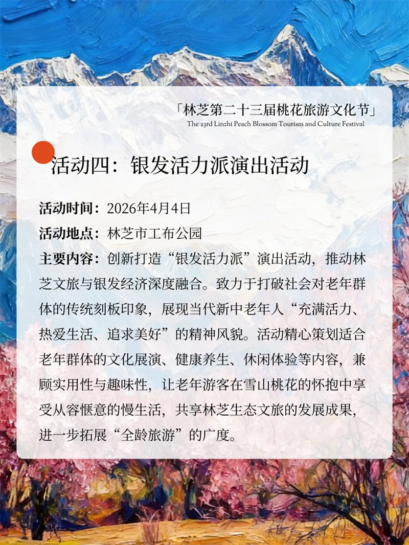 精心策划适合老年群体的文化展演、健康养生、休闲体验等项目,让老年游客在雪山与桃林间享受慢时光,进一步拓展“全龄旅游”的广度。