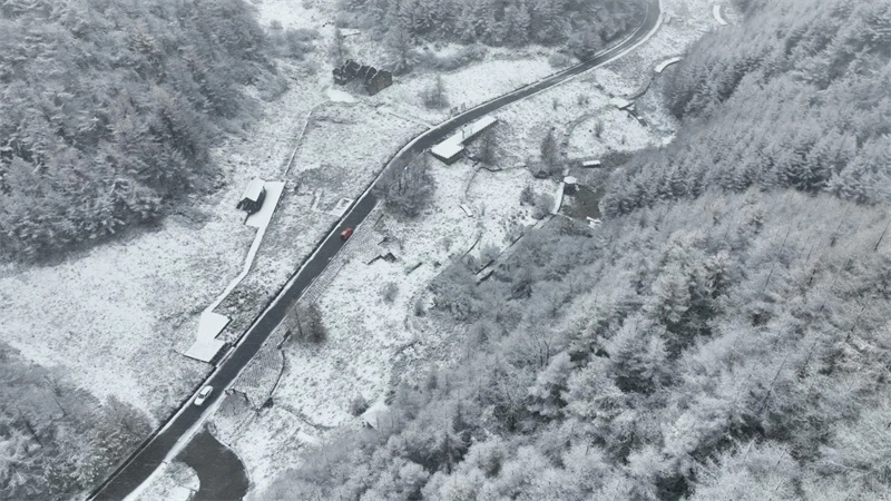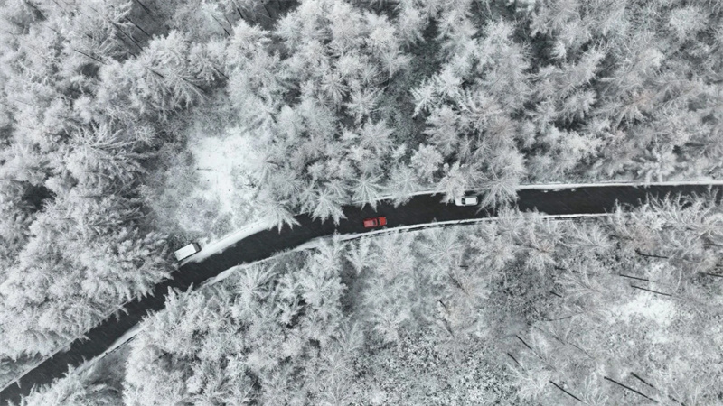 远山如黛,雪色如银。蜿蜒的旅游公路如玉带般环绕在群山之间,两侧的林木挂满了晶莹的雾凇,每一根枝条都包裹着茸茸的雪绒,在微风中轻轻摇曳,洒下细碎的银光。山间的风,带着清冽的气息,吹走了所有的烦扰,只剩下一片心灵的宁静。