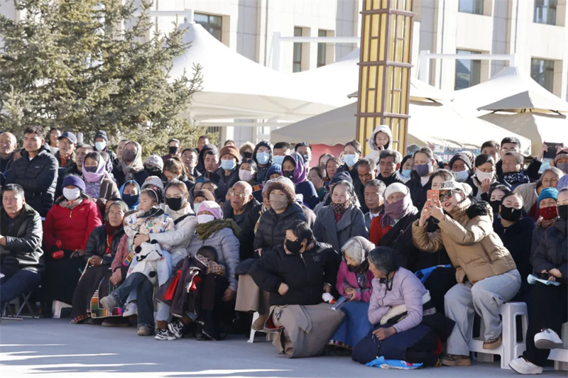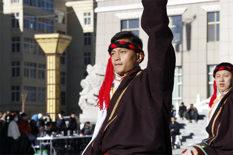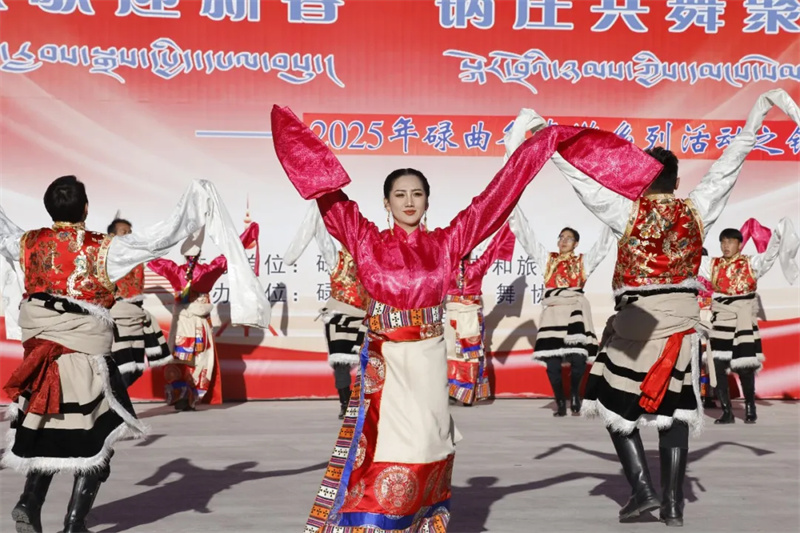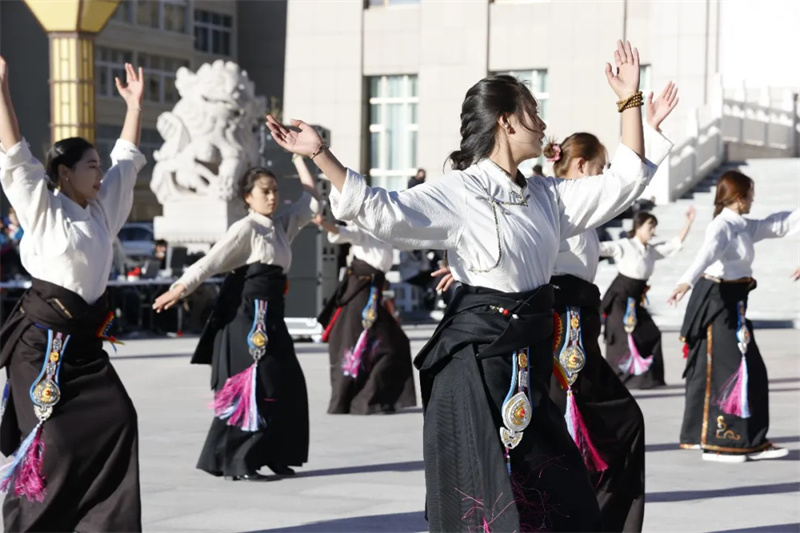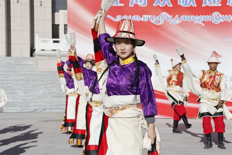 展演现场,彩袖飞扬,歌声嘹亮。队员们身着色彩斑斓的藏族传统服饰,男子舞姿矫健洒脱,女子动作柔美流畅。