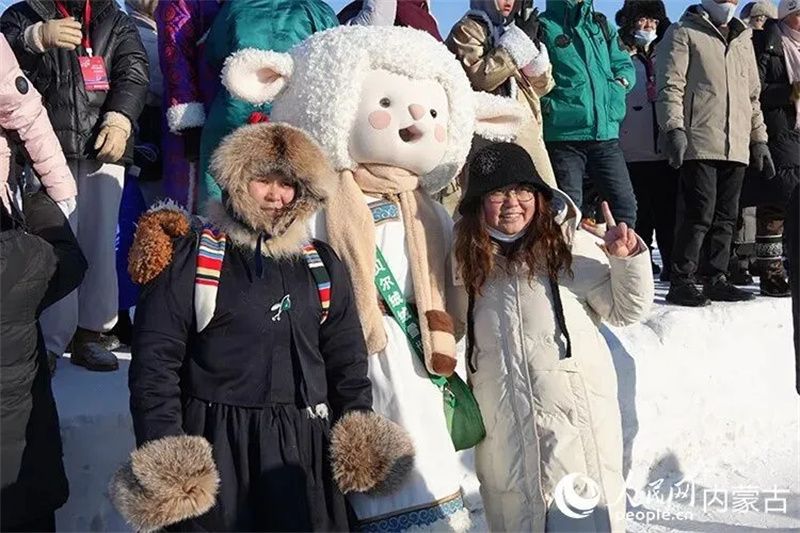 游客和冰雪那达慕吉祥物“呼伦小羊”合影。人民网记者 赵梦月摄