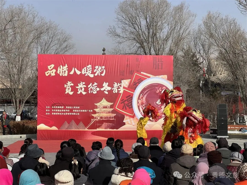 民俗盛宴添暖意,非遗传承润人心。活动现场暖意融融,六大特色环节轮番上演,让腊八节充满文化质感。在“品腊八滋味·忆古城乡愁”环节,厨师选用贵德本地冬小麦慢火熬制特色腊八粥,1000余份热气腾腾的粥品免费派送,群众游客有序排队领取,一碗粥的黏稠咸香中,盛满了古城的乡愁与节日的温情。“欢歌贺新岁·腊味满古城”环节中,本土非遗歌舞、传统舞狮表演轮番登场,将贵德文化的独特韵味展现得淋漓尽致,沉浸式演出让观众直呼过瘾。
