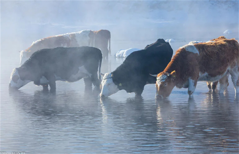 清晨的不冻河最是动人。哈拉哈河的水汽在微凉空气中凝成细碎冰晶,缭绕在河谷之上,如轻纱般漫过褐色的火山岩。未封冻的河水澄澈碧绿,与岸边半融的残雪相映成趣,牛羊低头饮水,蹄印踏碎薄冰,溅起细碎的水花,在晨雾里勾勒出灵动的轮廓。远处的白狼峰披着淡金色的晨光,云海在山谷间翻涌,初升的太阳为雪岭镀上玫瑰色的边,天地间静谧得只剩风声与鸟鸣。