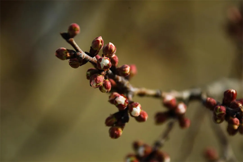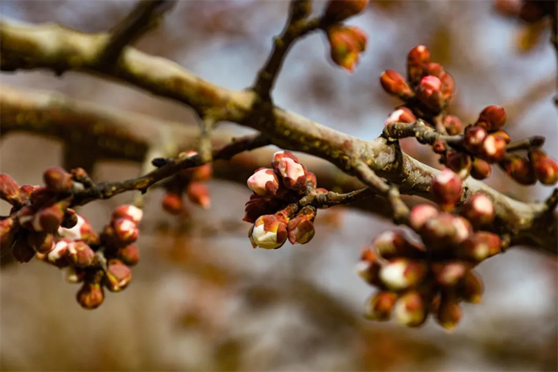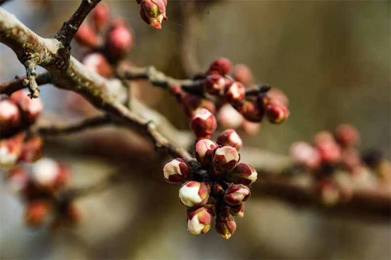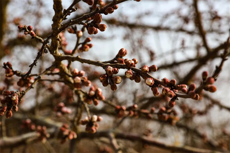 干褐色的枝梢间密密麻麻地缀满了饱满的花苞。