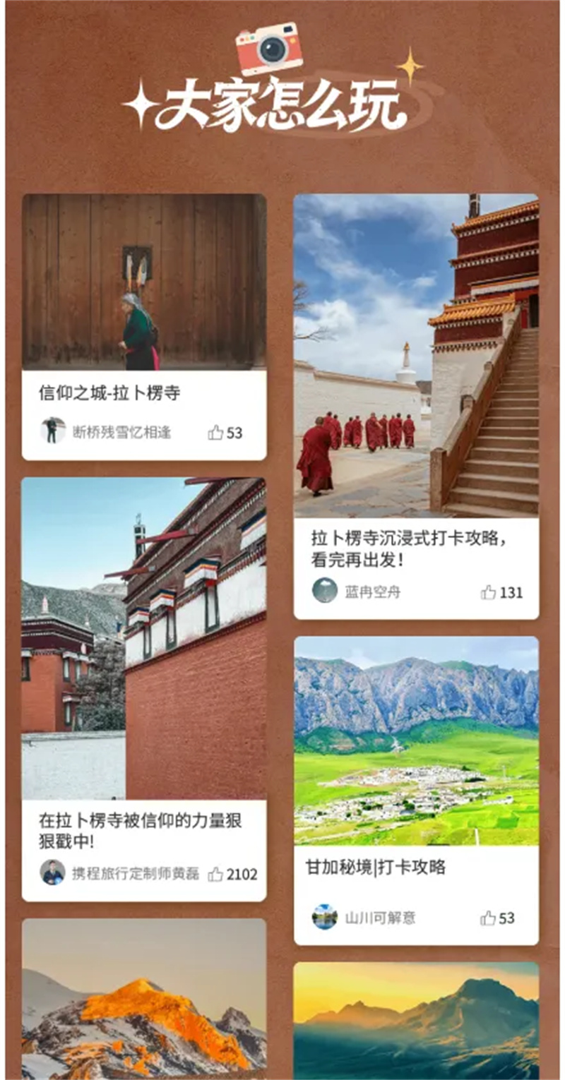 打开携程旅行APP,首页搜索框输入“夏河”“甘南”“拉卜楞寺”“甘加秘境”“夏河非遗”等关键词,点击搜索结果,即可进入专辑页。