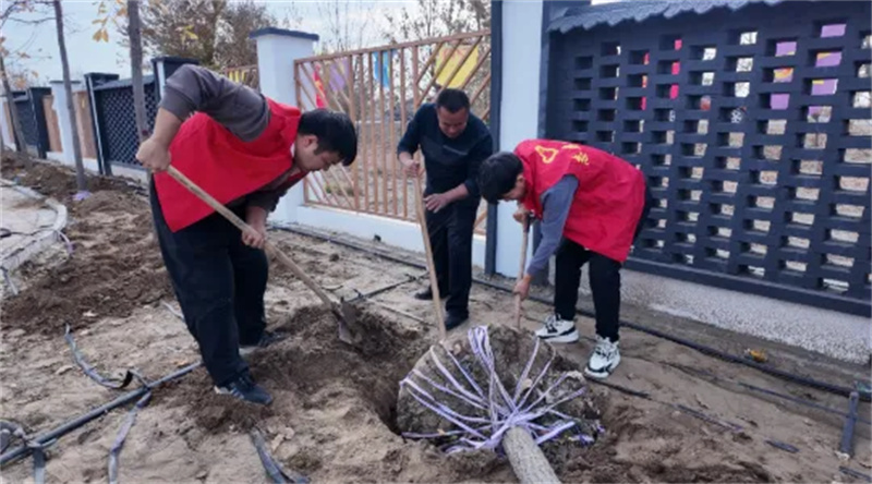 志愿者席莎莎笑着说:“看着树苗排成行,就想着明年春天这里开花,村民路过都能赏景,现在累点也值!”(图文:严冰心 )