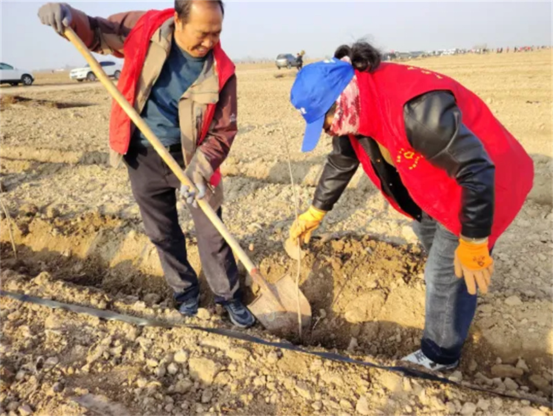植树现场,干部职工和志愿者们干劲十足。有的两人一组,默契配合,一个扶苗,一个填土;有的三五成群,分工协作,运苗、挖坑、栽树。