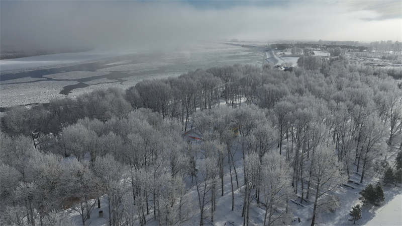 11月5日,黑龙江省大兴安岭呼玛县迎来今冬首场雾凇奇观。中俄界江黑龙江呼玛镇江段雾霭升腾,江畔树木凝结起晶莹冰晶,与江面上缓缓流动的跑冰排相互映衬,构成一幅冬日浪漫图景,吸引众多市民游客驻足观赏。