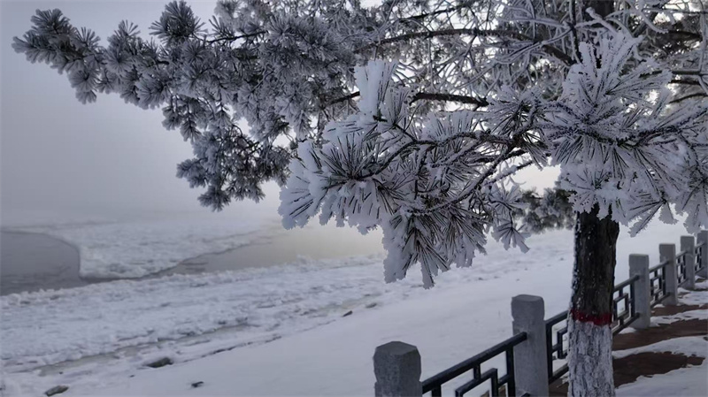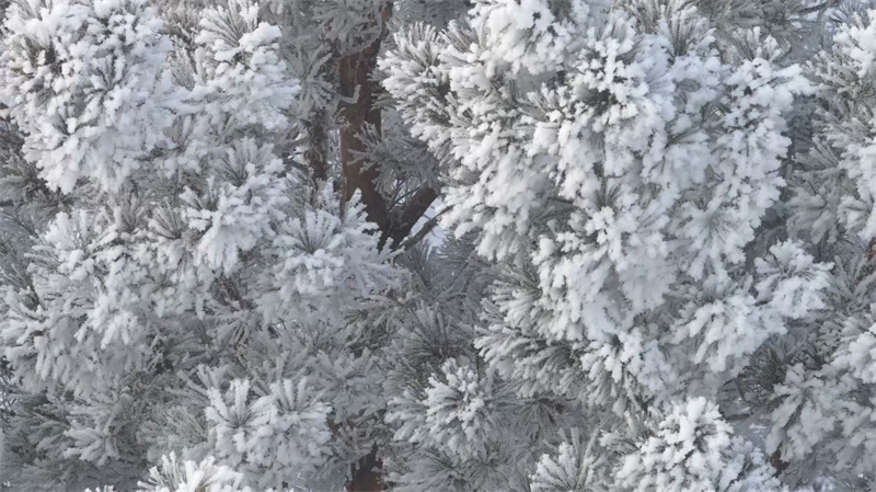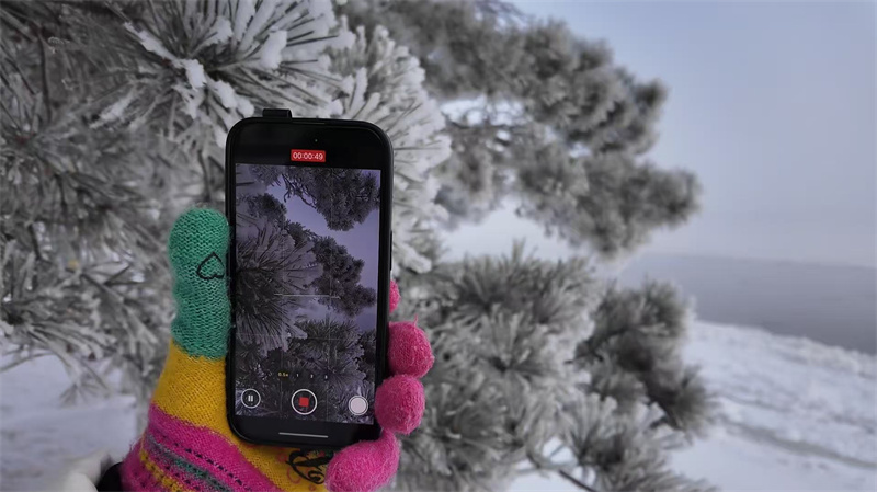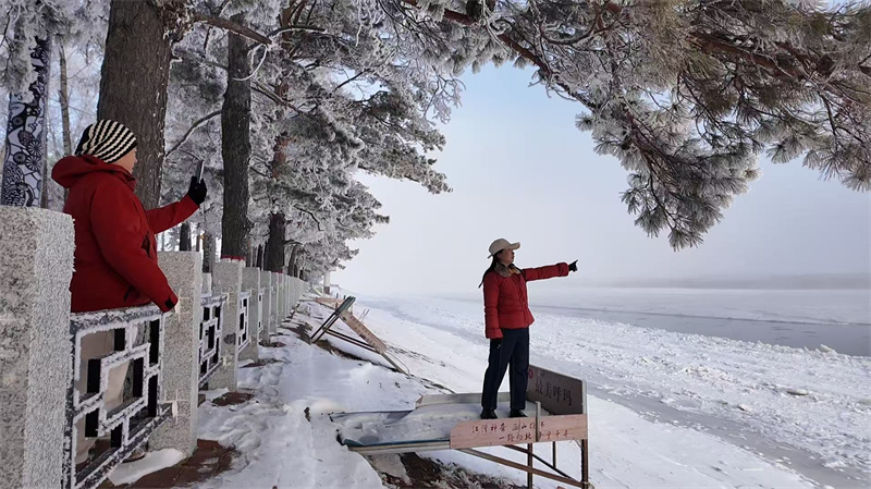 在低温与黑龙江未冰封的水汽共同作用下,江畔松柏、杨树、柳树的枝桠裹上了一层薄冰,原本翠绿的松柏似覆上柔软棉纱,树冠远看如烟似雾,与蓝天连成一片;洁白的树枝仿佛宣纸上晕染的丹青,在蓝天白云映衬下格外醒目。江面上,冰排随江水缓缓移动,阳光照射下反射出耀眼光芒,与岸边雾凇形成“一动一静”的对比,更添景致之美。游客们举着手机记录,镜头里既有雾凇的晶莹,也有冰排的灵动。不少居民沿着江畔漫步,近距离触摸雾凇,感受其凉丝丝的质感,还有人用相机定格“树挂”与冰排同框的画面。