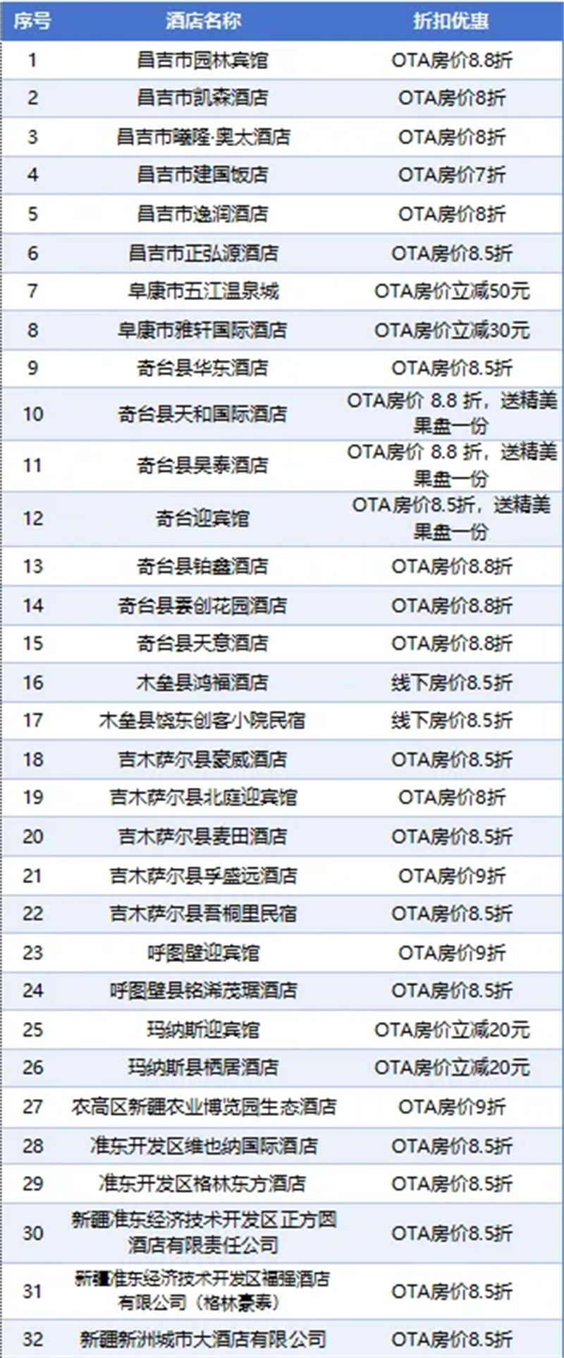 奇台县:印象古城度假村、古榆别院餐饮服务中心、颐忻园度假村享就餐8折优惠、牛很鲜火锅享就餐8.8折优惠、利源食府、吴记老掌柜川菜馆享就餐9折优惠;