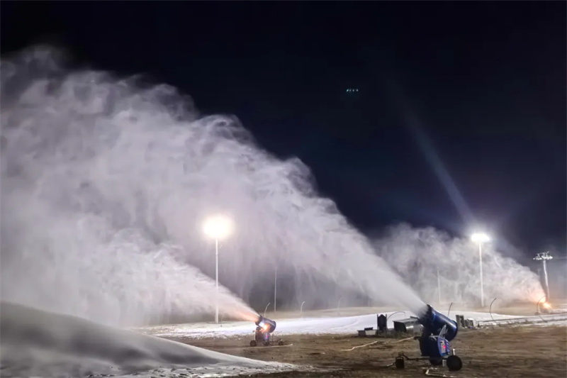 昨日,记者走进大河湾滑雪场,夜色中的造雪场景蔚为壮观。11台造雪机全力运转,冷水与压缩空气混合后化作细密雪粒,在零下2摄氏度的气温中飘落堆积。工作人员身着防寒服不间断巡查,根据风向风速实时调整设备角度,确保雪质均匀松软。