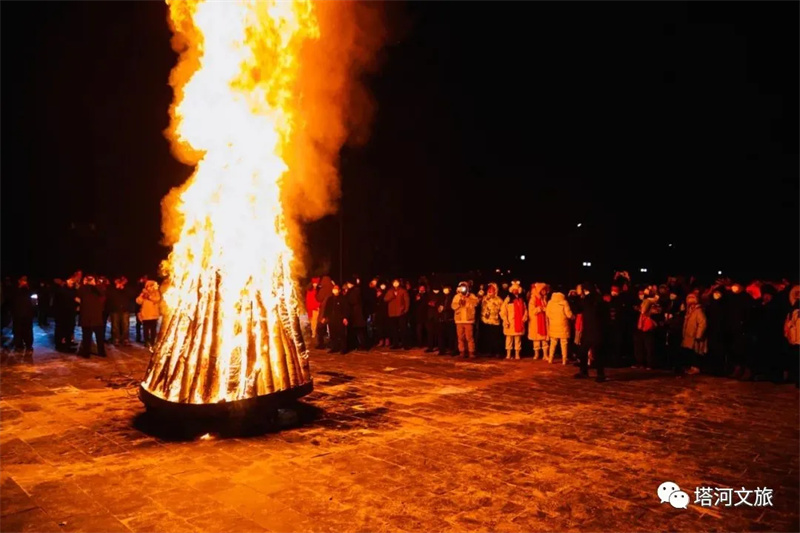 晚上,入住鄂伦春民宿,参加一场隆重的篝火晚会,篝火点燃,斗熊舞起,冬夜狂欢。