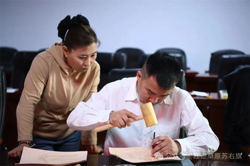 近日,苏尼特右旗非遗名家工作室“草原快骥”主题皮艺培训班开班,20余名皮艺爱好者积极参与。培训班特邀皮雕技艺非遗传承人宝然担任主讲教师,进行了为期三天的集中授课。