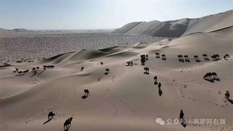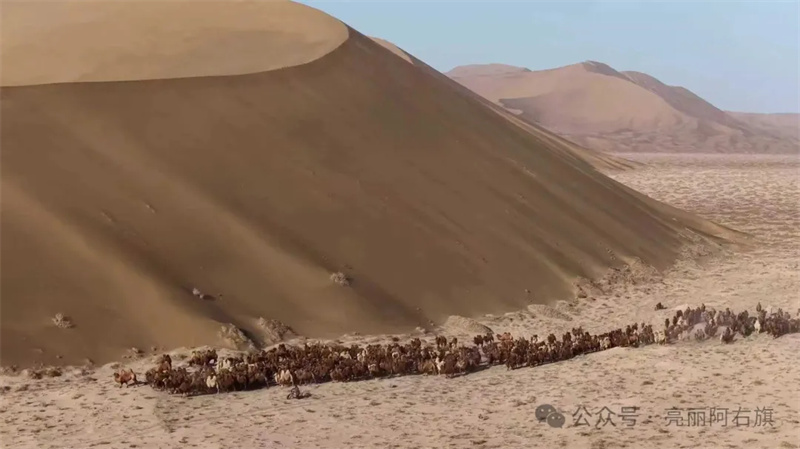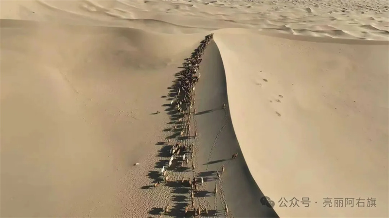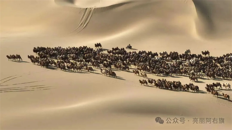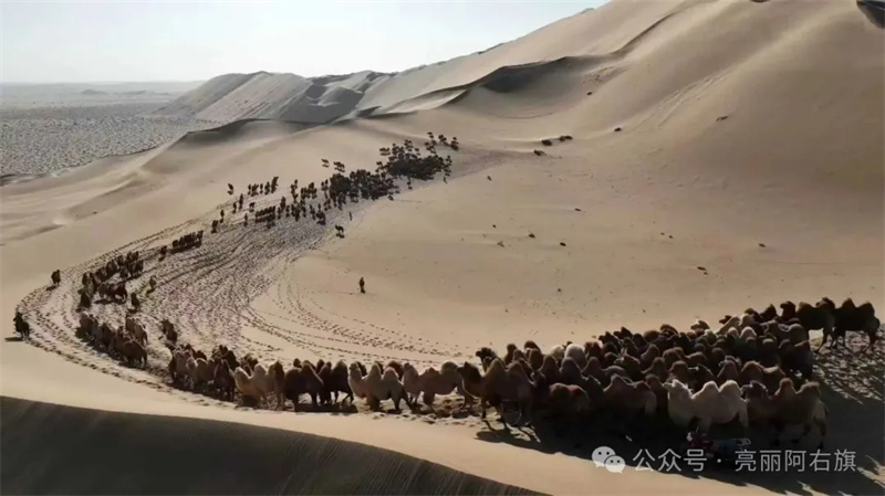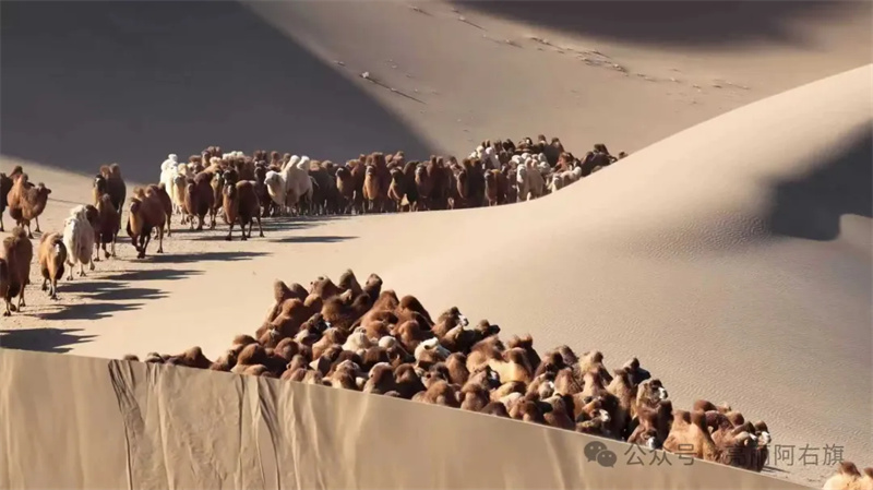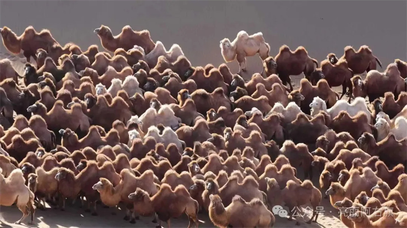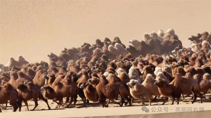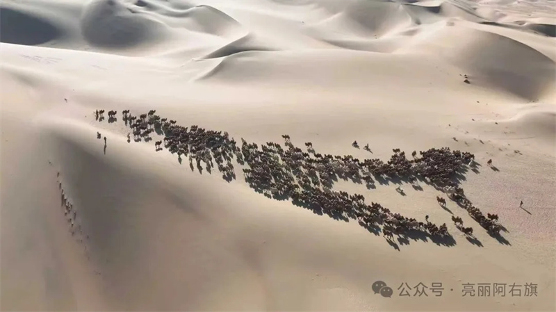 阿拉善右旗以双峰驼闻名于世,今年计划转场 2100 峰。据了解,本次冬季转场将历时一个月完成。