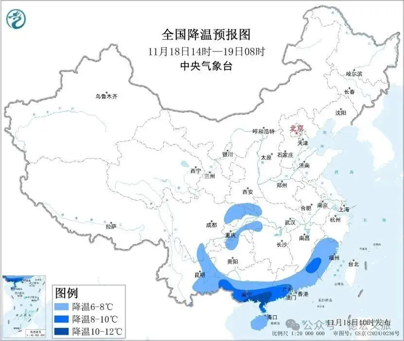 受强冷空气影响,预计,11月18日14时至19日8时,四川东部和南部、重庆、江西东部和南部、浙江南部、福建、广东东部和中南部、广西中南部、云南东部、海南岛等地有6~8℃降温,其中,广西南部、广东西南部等地的部分地区降温可达10℃以上。19日凌晨,最低温度0℃线将南压到苏皖南部至湖北中部一带。
