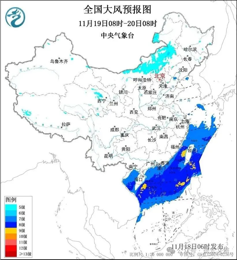 11月19日8时至20日8时,内蒙古东北部、河北北部等地部分地区有5~6级风,阵风7级;东海南部海域、台湾海峡、台湾以东洋面、巴士海峡、南海北部和中部海域、北部湾将有7~8级、阵风9~10级的大风,其中台湾海峡、台湾以东洋面、巴士海峡、南海东北部和中西部的部分海域风力可达9级、阵风10~11级。