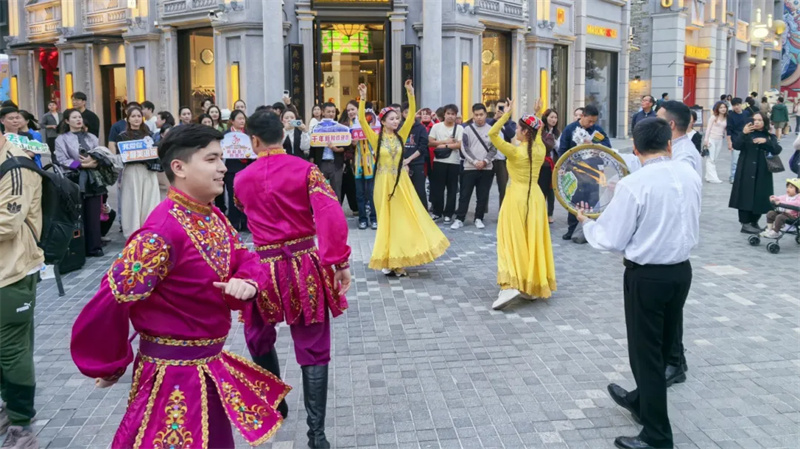 一曲舞毕,现场掌声如潮,围观群众齐声喊着“再来一个”。手鼓演员随即登场,咚咚锵的节奏刚起,便有市民和游客跟着拍手附和。“能现场欣赏到这么正宗的新疆特色歌舞,太幸运了!”深圳市民曹文杰说,这场意外之喜让他对新疆的向往又深了一层,“下次旅游目的地就定阿克苏!”