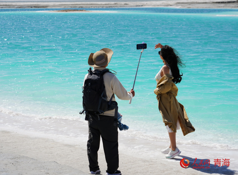游客在大柴旦翡翠湖拍照。人民网记者 况玉摄