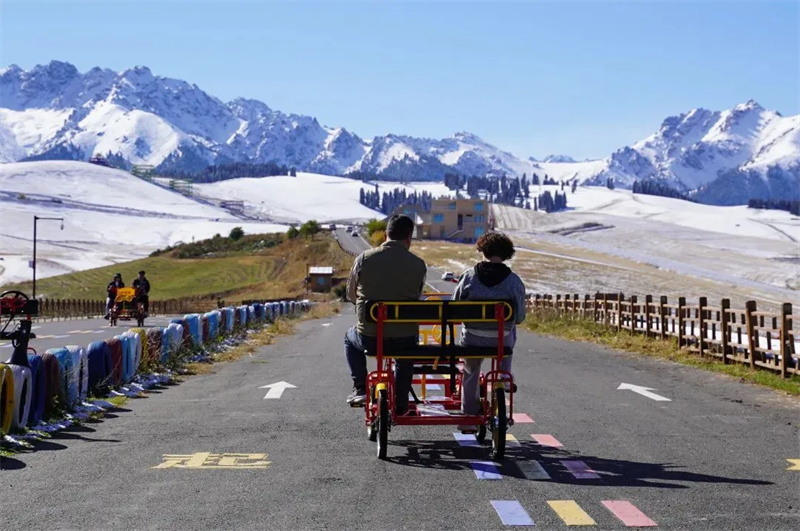 西域努尔加滑雪场的趣味冰雪项目同样精彩,雪圈飞驰、雪地拔河让亲子互动充满欢笑,在速度与激情中感受冰雪运动的魅力。