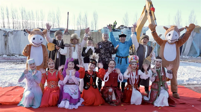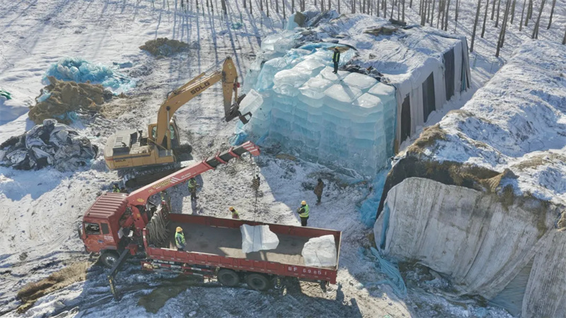 仪式现场气氛热烈,一块块被塑料布与草席严密包裹的存冰在众人期待中逐渐揭开“面纱”,质地晶莹剔透,令人赞叹。县文工团的演员们献上了极具民族风情的精彩演出,悠扬的歌声与欢快的舞蹈交织,为启冰仪式增添了浓厚的文化氛围。随着启冰环节的顺利完成,所有储备冰块将被有序运往湿地公园指定区域,“天山冰雪乐园”实体建设工作全面启动。