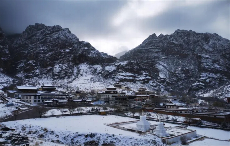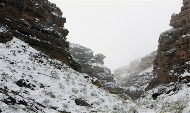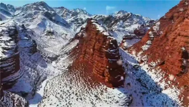 冰封仙境:额日布盖峡谷的丹霞岩壁与白雪碰撞,色岩层覆雪如泼墨画卷,风蚀洞穴与冰挂交织,橙红与雪白相映成趣,宛如冰雪封存的秘境。