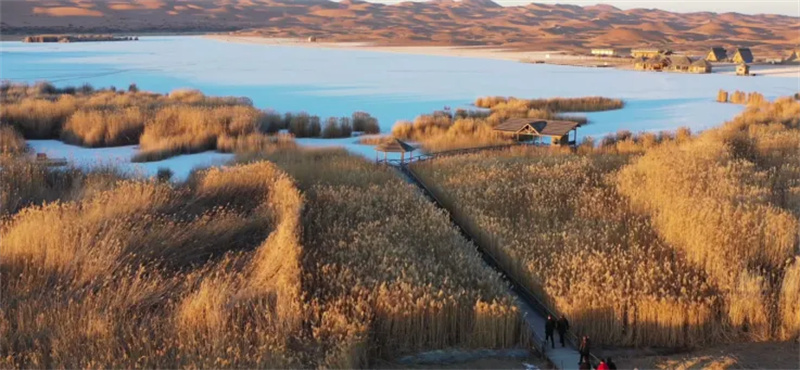 下午驱车前往腾格里达来月亮湖沙漠生态旅游区(4A),冬季月亮湖部分冰封,湖面与沙丘、白雪构成绝美画面,参与雪地越野、沙漠徒步,或在湖边静坐赏景。