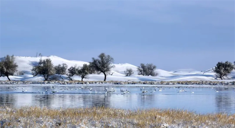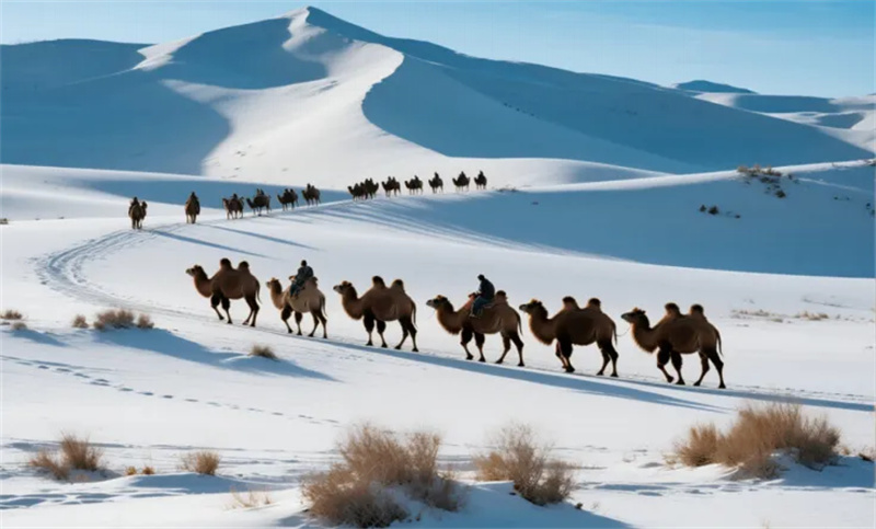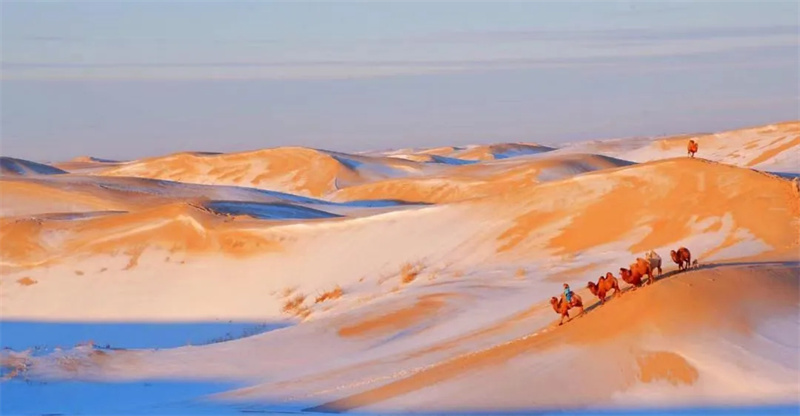 踏雪寻沙:巴丹吉林、腾格里、乌兰布和三大沙漠的沙丘被白雪覆盖,形成“银雪裹金沙”的奇景,沙脊线条在雪光中愈发柔美,越野车辙划破雪原,沙粒与冰晶在阳光下闪烁如星。